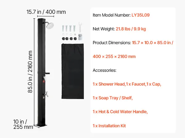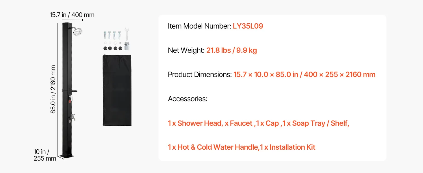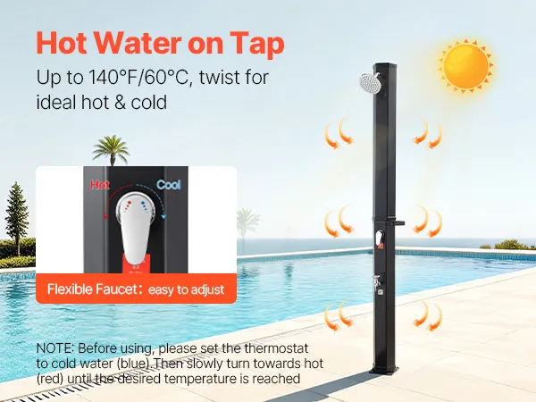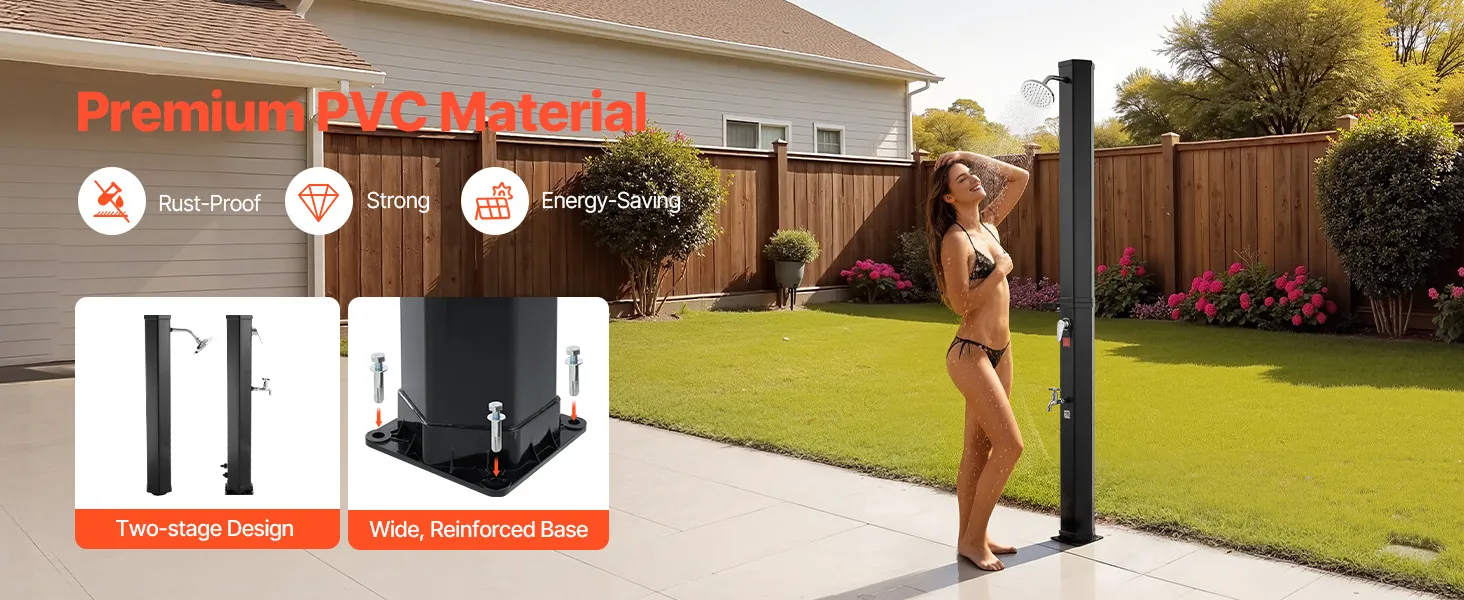 Douche met zonneverwarming (35 liter): Ontworpen voor warme buitendouches op zonne-energie. Met een inhoud van 35 liter (9,2 gallon) biedt deze douche regelbaar warm en koud water voor een optimale douche-ervaring in de buitenlucht. Let op: alleen geschikt voor de zomer of milde herfst, niet voor de winter.