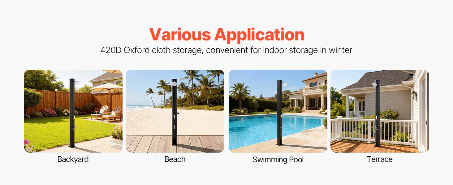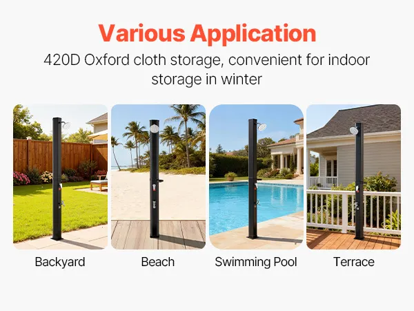 Geniet van uw buitendouche: ideaal om af te spoelen voor of na het zwemmen, of om af te koelen op warme dagen; perfect voor in de tuin, op het strand, bij het zwembad of op het terras; inclusief een 420D Oxford-hoes ter bescherming tegen de weersomstandigheden; ook geschikt om binnenshuis op te bergen tijdens de koudere maanden.