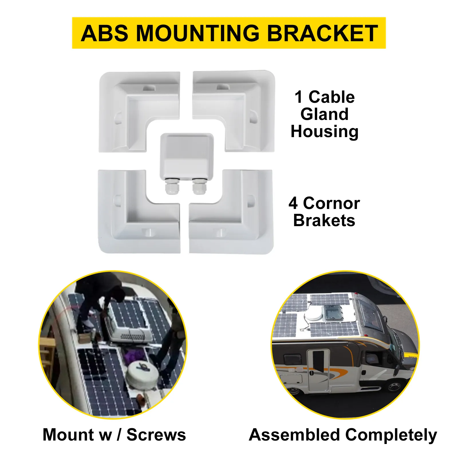 De oplaadkit voor zonne-energie wordt geleverd met ABS-montagebeugels, inclusief 4 hoekbeugels en 1 kabelwartelbehuizing om de panelen moeiteloos en stabiel te bevestigen.