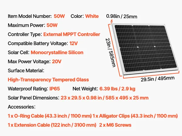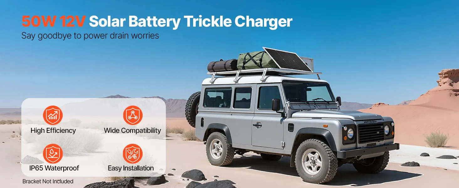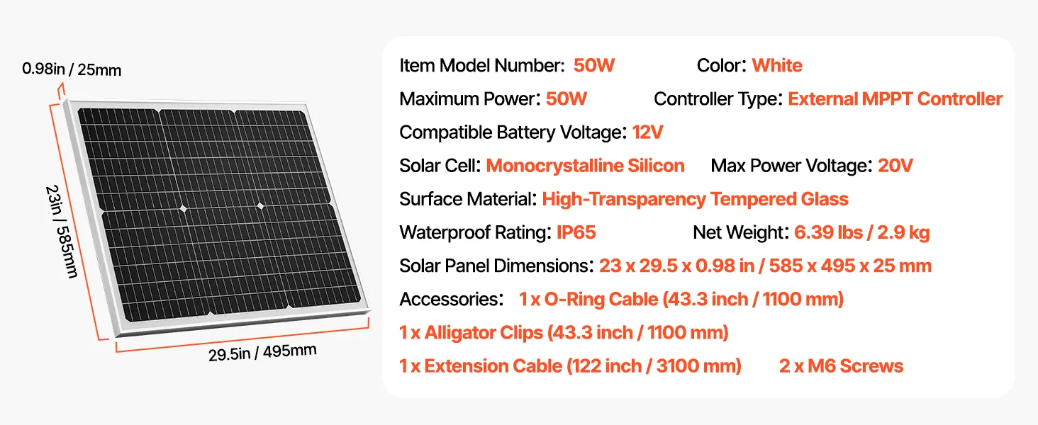 Snel en efficiënt opladen: Deze 50W 12V zonne-acculader met zeer efficiënte monokristallijne cellen en zeer transparant gehard glas zorgt voor een hoge conversie-efficiëntie, een hogere laadsnelheid en snel opladen van de accu