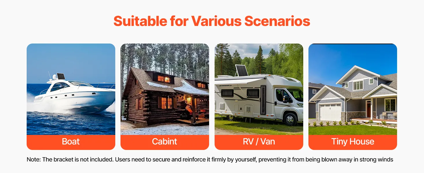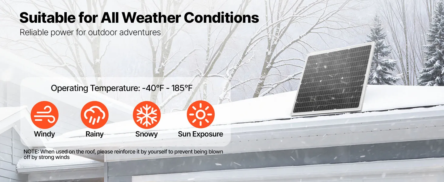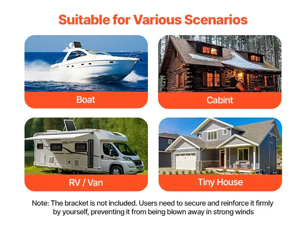 Geschikt voor vlakke plaatsing in tuinen, op daken en in voertuigen met platte daken. Levert stabiele stroom voor uw 12V-accu's. (De houder is niet inbegrepen. U dient deze zelf te bevestigen en te verstevigen om te voorkomen dat hij bij harde wind wegwaait.)