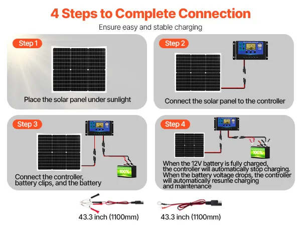 Eenvoudig aan te sluiten: Deze zonne-acculaadset bevat een verlengkabel van 3100 mm (122 inch) en twee verbindingskabels: krokodillenklemmen van 1100 mm (43,3 inch) en O-ringconnectoren van 1100 mm (43,3 inch) waardoor u de set eenvoudig kunt aansluiten op verschillende 12V-accu's.