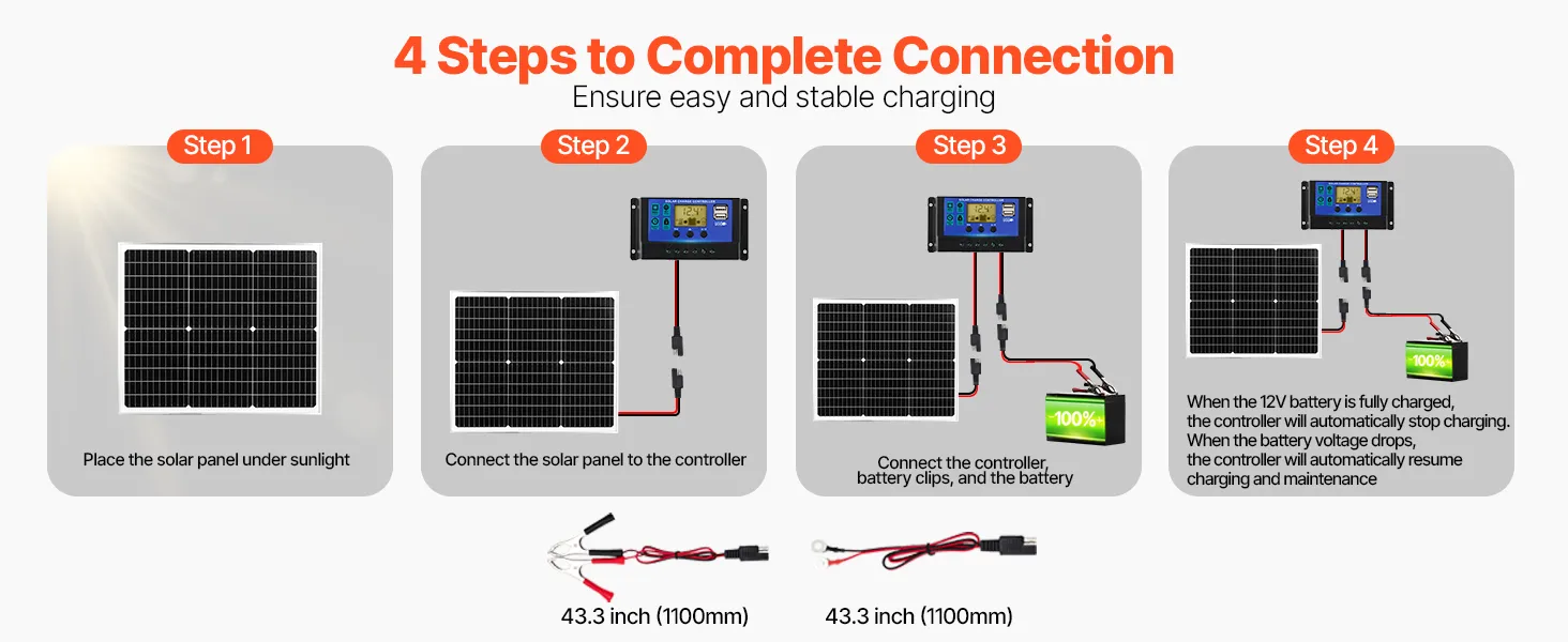 Brede compatibiliteit: Compatibel met meerdere 12V-accu's, waaronder LiFePO4, Li-ion, AGM, Gel, SLA en EFB. Ideaal voor vlakke plaatsing in tuinen, op daken of in voertuigen met platte daken. Veelzijdige toepassingen zijn onder andere boten, campers, auto's, aanhangwagens, motoren, grasmaaiers, waterpompen, poortopeners, gereedschapsschuren en meer.