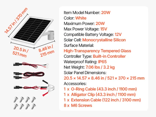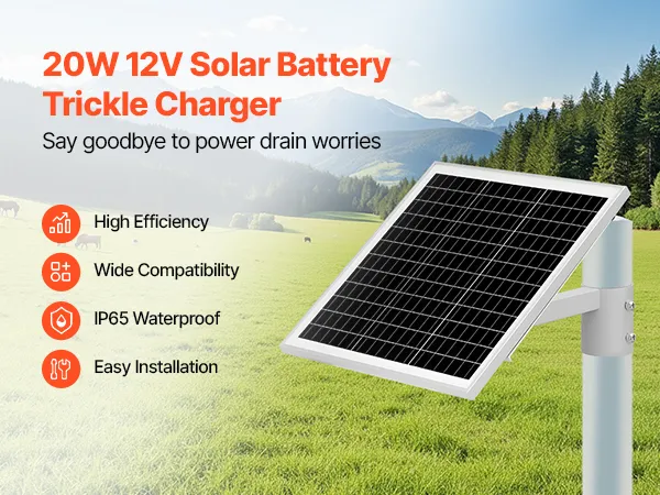 Onze 20W 12V accu-onderhoudslader op zonne-energie maakt gebruik van zonne-energie om uw 12V accu's betrouwbaar van stroom te voorzien. Uitgerust met zeer efficiënte monokristallijne zonnecellen, zorgt hij voor stabiel opladen en onderhoud van poortopeners, elektrische hekken, landbouwmachines, grasmaaiers en meer.