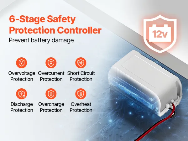 De zonnepaneel-acculader beschikt over een ingebouwde intelligente controller die meerdere beschermingslagen biedt. Zo wordt een geoptimaliseerde laadefficiëntie gegarandeerd en worden uw accu en zonne-energiesysteem beschermd.