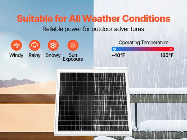 Weerbestendig: Deze waterdichte zonnepaneellader met IP65-classificatie werkt betrouwbaar onder extreme omstandigheden van -40 °C tot 85 °C (-40 °F tot 185 °F). Hij is bestand tegen wind, regen, sneeuw en zon, waardoor hij ideaal is voor langdurig gebruik buitenshuis.