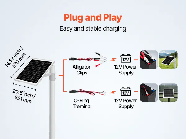 Eenvoudig te installeren en aan te sluiten: Deze druppellader op zonne-energie wordt geleverd met een 0-60° verstelbare paalbevestiging en is geschikt voor palen met een diameter van 40 tot 68 mm. Een verlengkabel van 3100 mm, O-ringklemmen van 1100 mm en krokodillenklemmen van 1100 mm worden meegeleverd voor eenvoudige aansluiting.