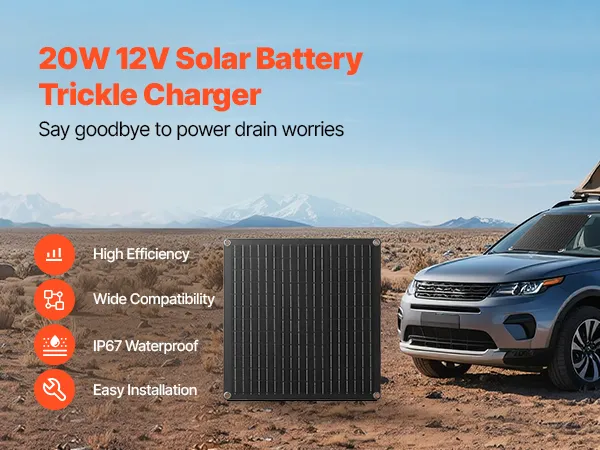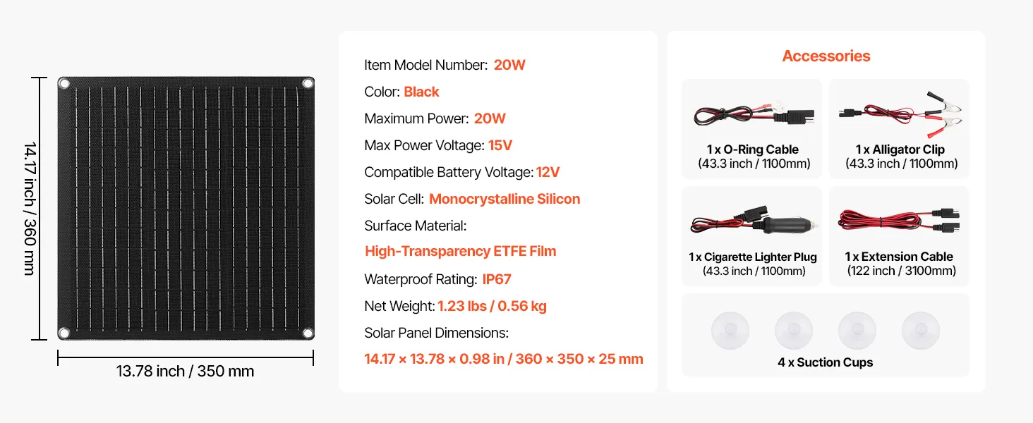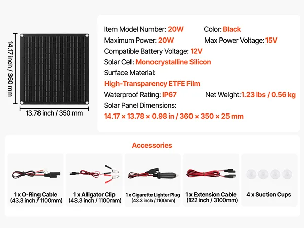 Hoge efficiëntie bij het opladen: Deze VEVOR 20W 12V zonnepaneelacculader is uitgerust met efficiënte monokristallijne cellen en een zeer transparante ETFE-folie. Hierdoor is de conversie-efficiëntie hoger en de laadsnelheid hoger, waardoor uw accu snel wordt opgeladen.