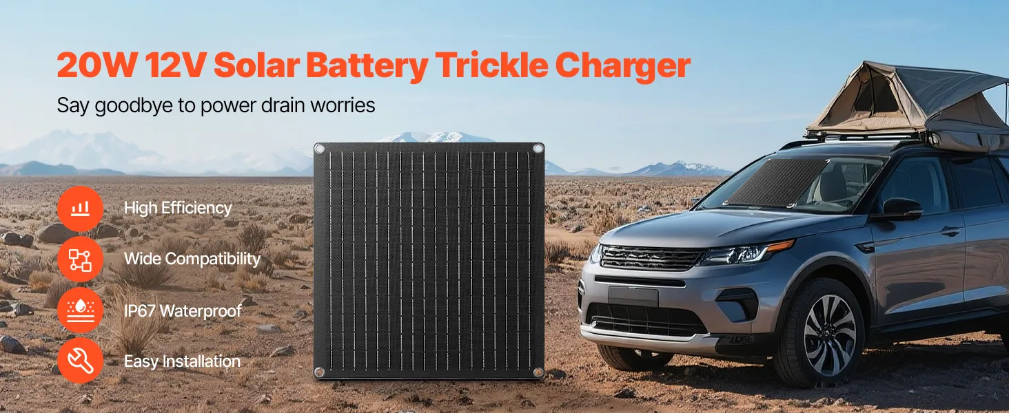 Nooit meer lege accu's! Onze 20W 12V druppellader op zonne-energie gebruikt zonne-energie om 12V accu's betrouwbaar van stroom te voorzien. Uitgerust met zeer efficiënte monokristallijne zonnecellen, zorgt hij voor stabiel opladen en onderhoud van auto's, campers, boten, motoren en meer.
