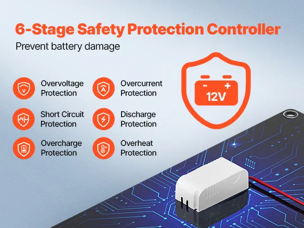 De zonnepaneelacculader is voorzien van een ingebouwde intelligente controller die meerdere beschermingslagen biedt. Deze zorgt voor een geoptimaliseerde laadefficiëntie en beschermt tegelijkertijd uw accu en zonnesysteem.