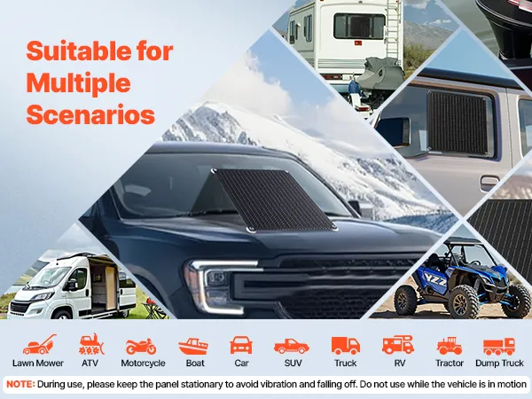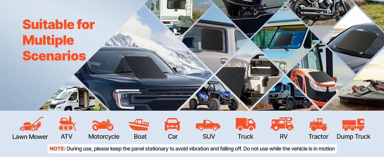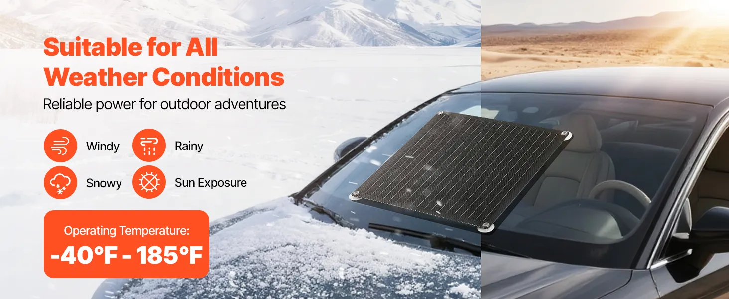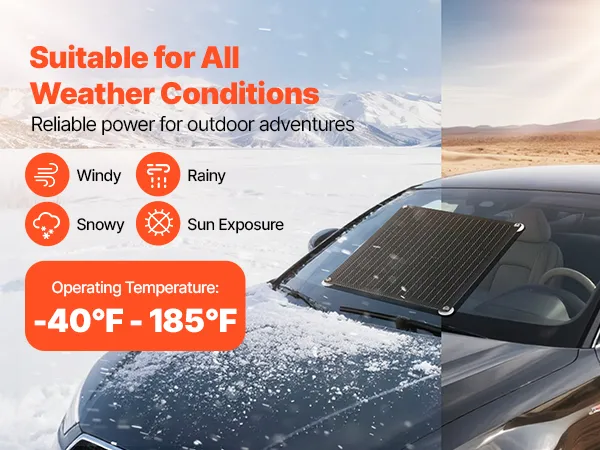 Weerbestendig: Onze waterdichte zonne-acculader (IP67) werkt betrouwbaar van -40°F tot 185°F en is bestand tegen wind, regen, sneeuw en zon, voor langdurig gebruik buitenshuis. (Houd het paneel stil tijdens gebruik. Niet gebruiken tijdens het rijden om trillingen of vallen te voorkomen.)