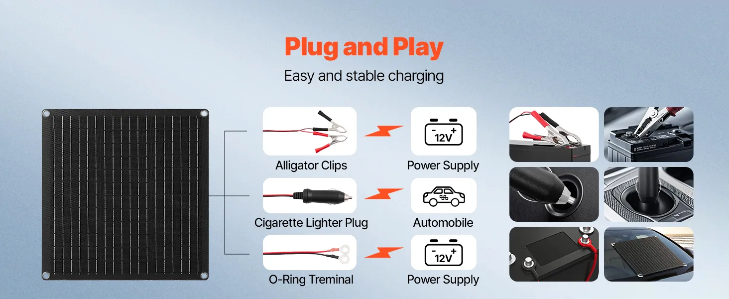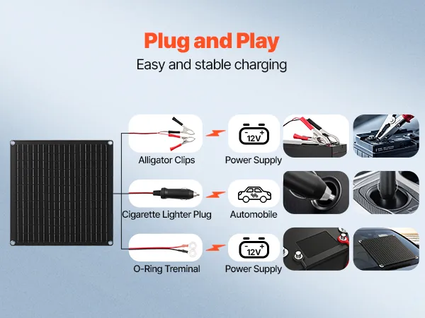Eenvoudig aan te sluiten: Deze acculaadset voor zonnepanelen bevat krokodillenklemmen van 1100 mm (43,3 inch), O-ringklemmen van 1100 mm (43,3 inch), een sigarettenaanstekerplug van 1100 mm (43,3 inch) en een verlengkabel van 3100 mm (122 inch). Gewoon aansluiten en snel opladen.