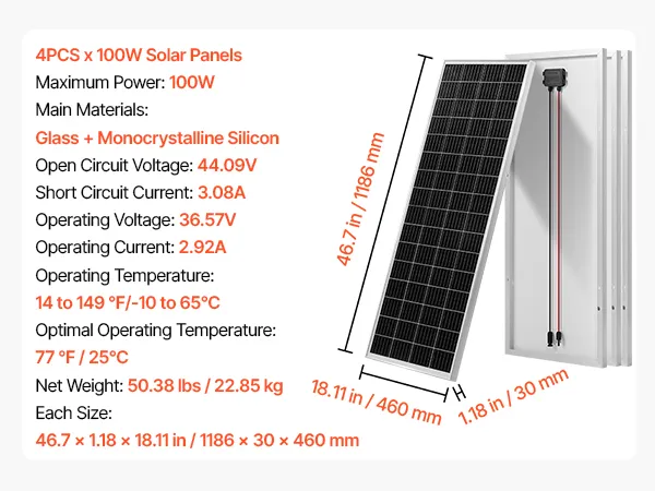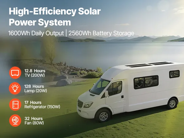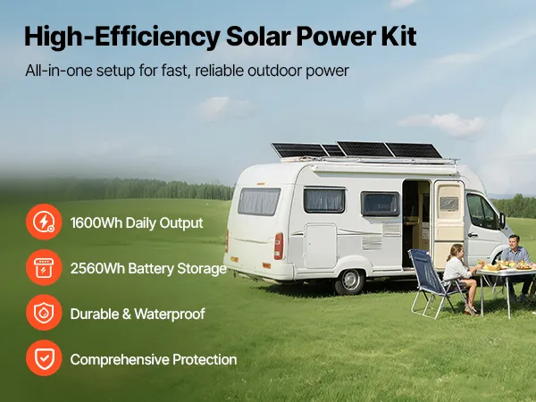 Deze zonne-energieset bevat vier monokristallijne zonnepanelen van 100 W, een 12,8 V 200 Ah LiFePO₄-accu, een 40 A MPPT-zonnelaadregelaar en een 12 V 2000 W-omvormer. Met een vermogen tot 1600 Wh/dag en een accuopslagcapaciteit van 2560 Wh levert hij betrouwbaar stroom voor campers, boten, huizen en meer.