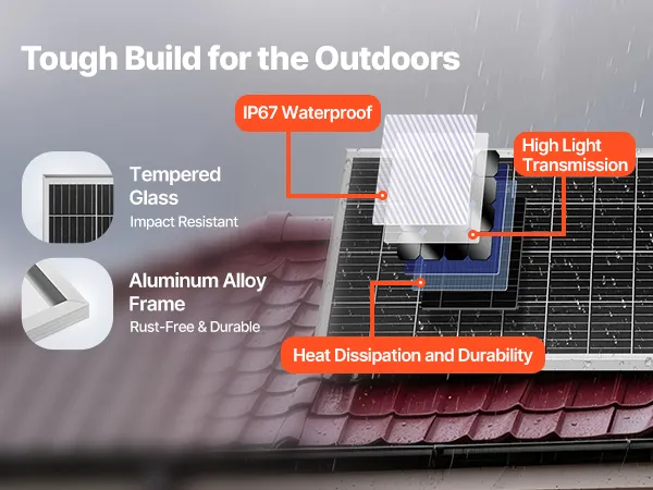 Efficiënt en duurzaam: het zonnepaneel maakt gebruik van zeer efficiënte monokristallijne zonnecellen voor een hoge lichttransmissie en uitstekende energieomzetting. Met een IP67 waterdicht ontwerp, slagvast gehard glas en een roestbestendig frame van aluminiumlegering garandeert het betrouwbare prestaties voor langdurig buitengebruik.