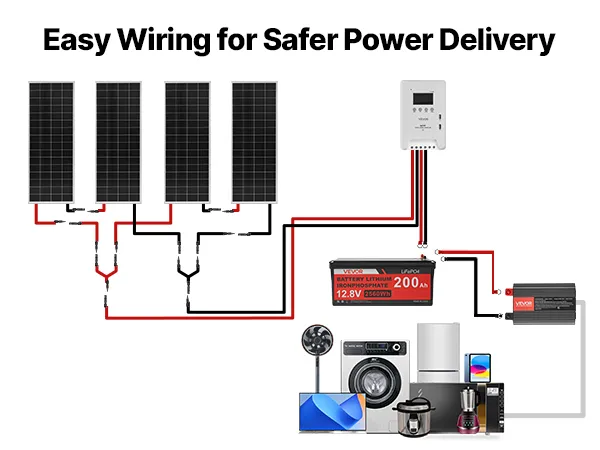 Zeer efficiënt zonnesysteem: Uitgerust met vier 100W zonnepanelen en een 12,8V 200Ah LiFePO₄ accu, levert deze complete zonne-energieset tot 1600 Wh/dag aan stroom met een accucapaciteit van 2560 Wh. Perfect voor campers, boten, huizen, campings en meer, biedt het een betrouwbare stroomvoorziening voor diverse huishoudelijke apparaten.