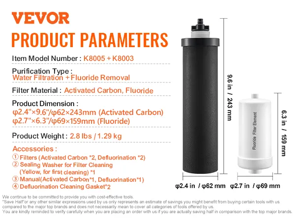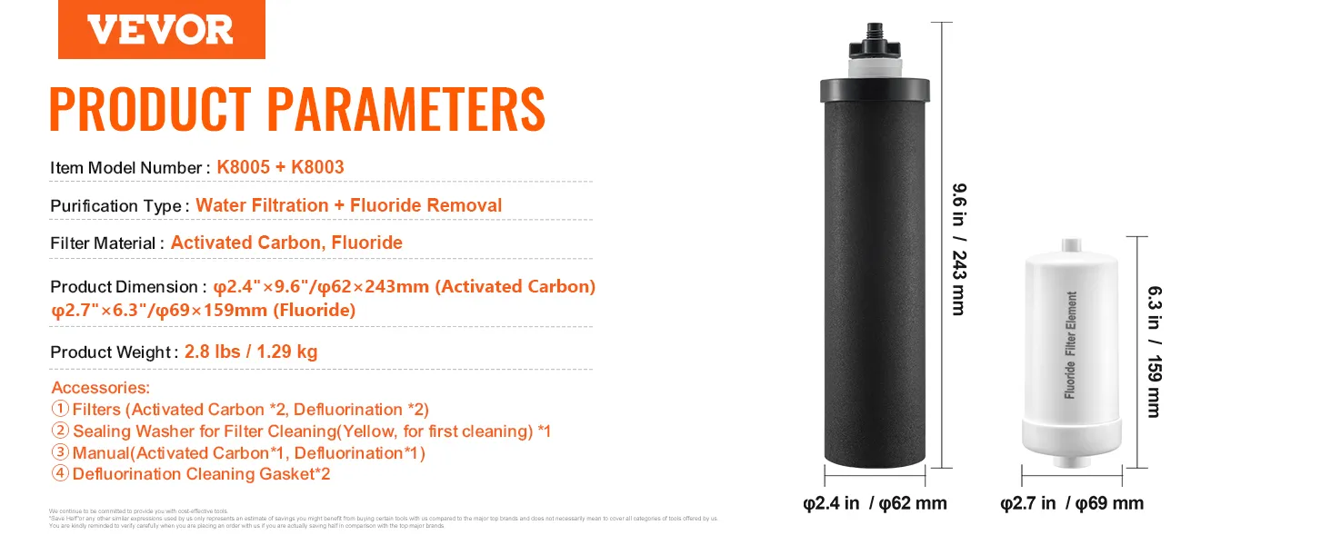 VEVOR Water Filters Replacement, Purification Elements, Replacement Filters, Gravity Water Filter System, Compatible with Most Brands, Pack of 4 (2 Activated Carbon Filter + 2 Defluorination Filter) VEVOR Water Filters Replacement, Purification Elements, Replacement Filters, Gravity Water Filter System, Compatible with Most Brands, Pack of 4 (2 Activated Carbon Filter + 2 Defluorination Filter)