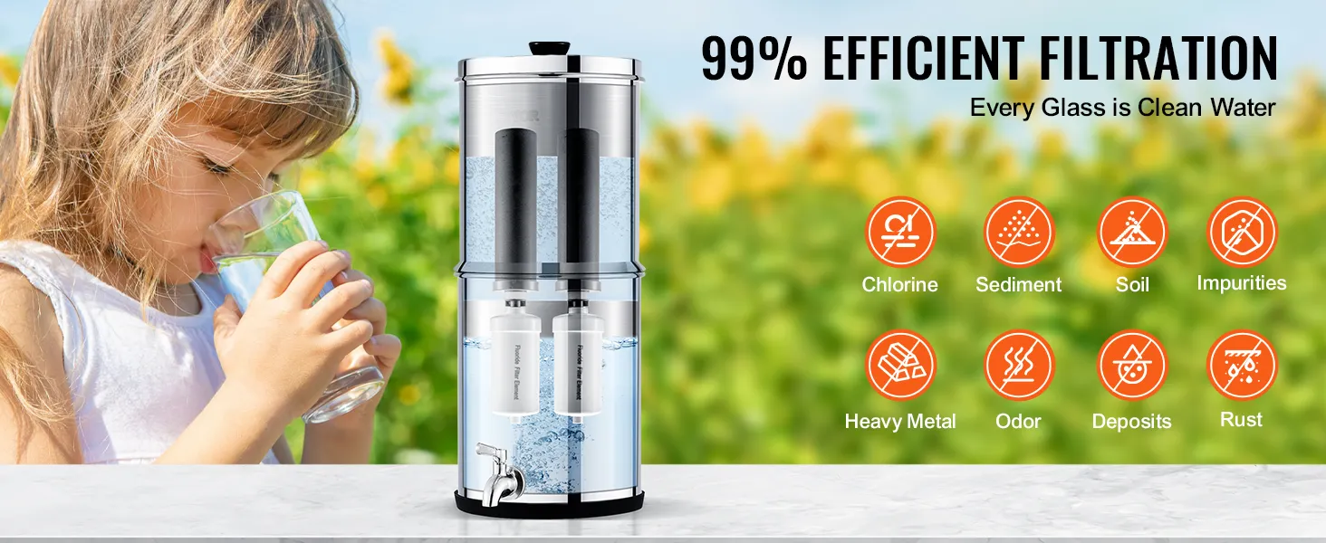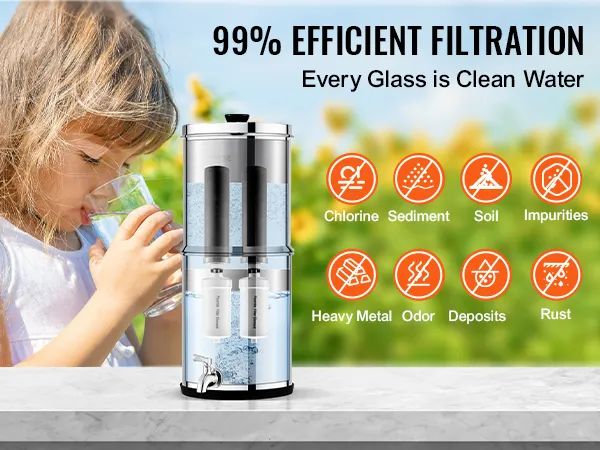 • 99.9% Effective Chlorine Removal: The gravity water filter provides effective filtration with fine pores that remove 99% of chlorine, and some fluorides from water. It improves water taste and reduces heavy metals, sediments, rust, soil, and other impurities.