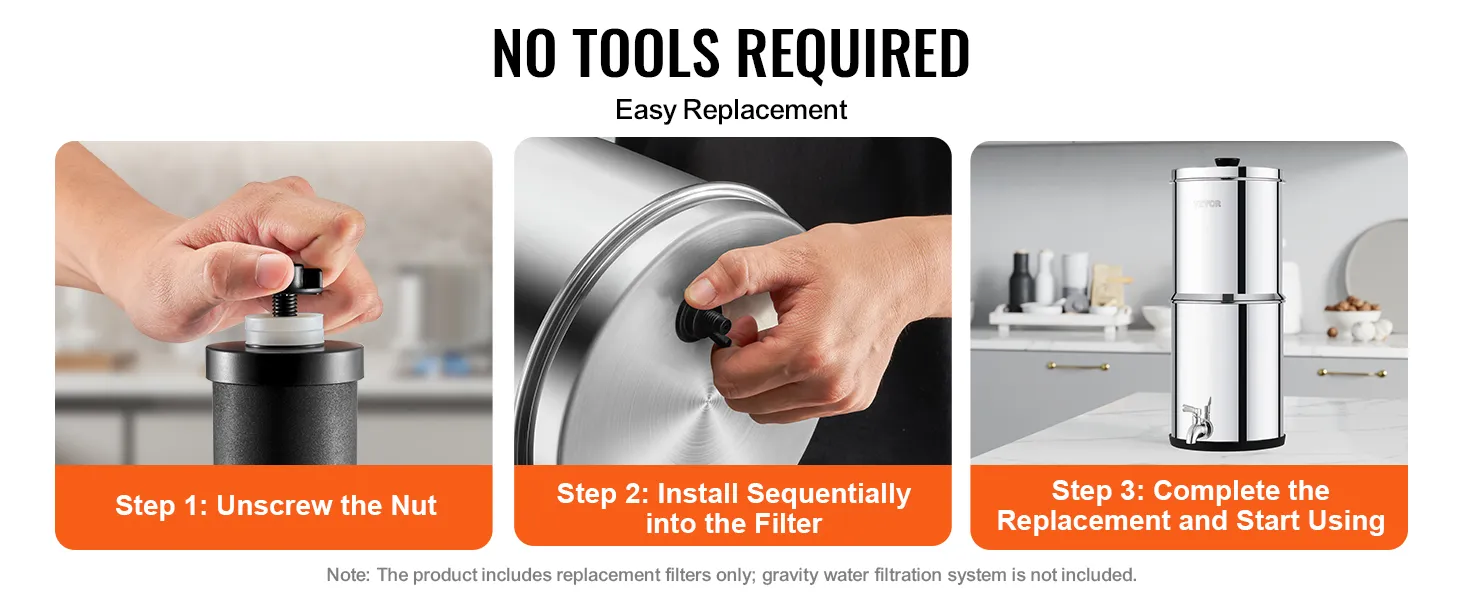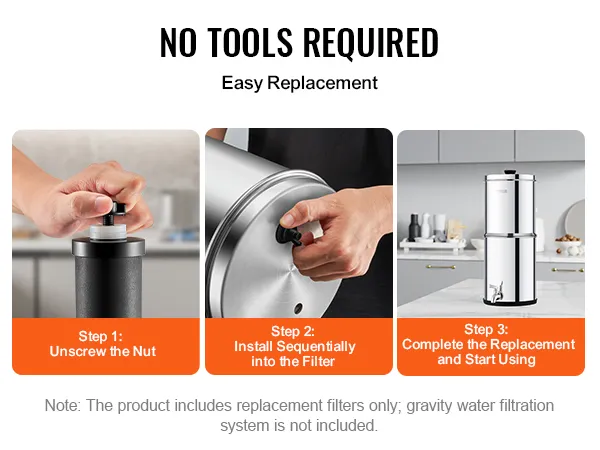 Our gravity water filter can be easily installed without any tools. Simply unscrew the nut and install the filters into the gravity water filter system. The tightly fitting nuts ensure no leakage, making the product perfectly compatible with various gravity water filtration systems.