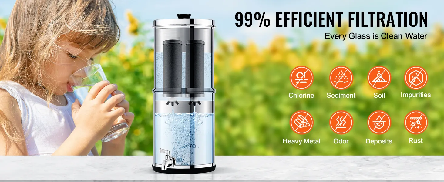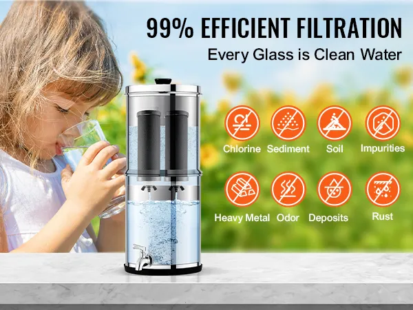 99.9% Effective Chlorine Removal: The gravity water filter provides effective filtration with fine pores that remove 99% of chlorine from water. It improves water taste and reduces heavy metals, sediments, rust, soil, and other impurities.