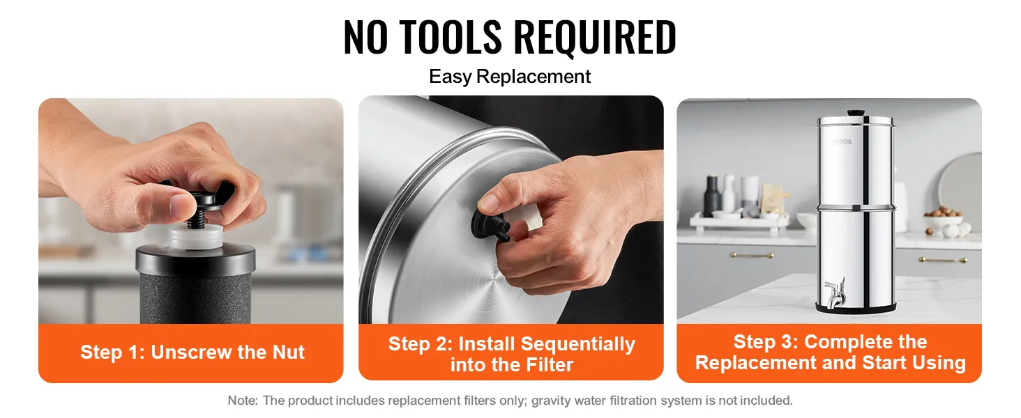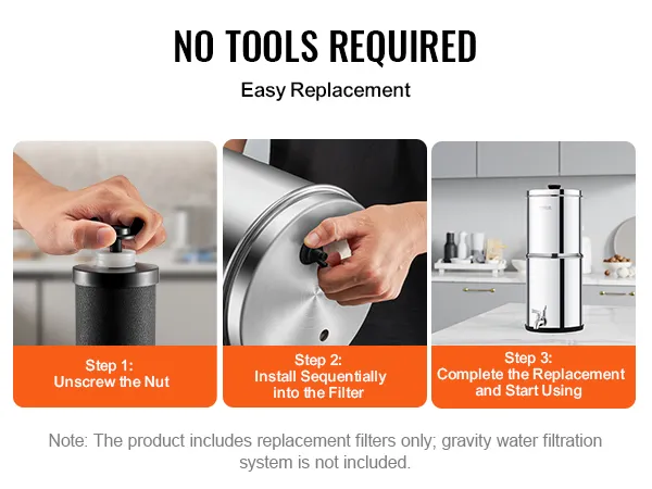 Our gravity water filter can be easily installed without any tools. Simply unscrew the nut and install the filters into the gravity water filter system. The tightly fitting nuts ensure no leakage, making the product perfectly compatible with various gravity water filtration systems.