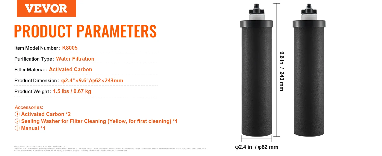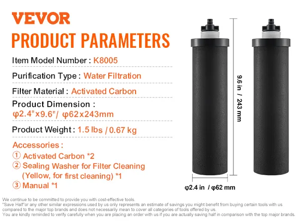 Vervangende zuiveringselementen voor VEVOR-waterfilters, vervangend filter met actieve kool (2-pack), eenvoudig vervangbaar waterfilter, vervanging voor zwaartekrachtwaterfiltersysteem, compatibel met de meeste merken