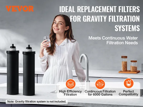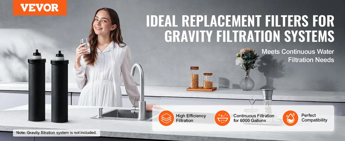 Onze vervangingsfilters zijn compatibel met de meeste zwaartekrachtwaterfiltratiesystemen op de markt en voldoen aan uw duurzame drinkwaterbehoeften. Elk paar filters kan continu tot 6.000 liter water zuiveren, waardoor de drinkwaterkosten effectief worden verlaagd.
