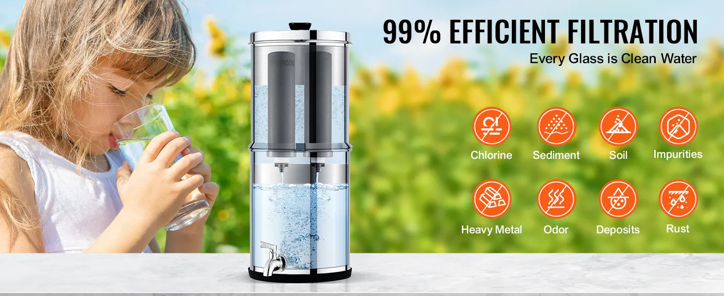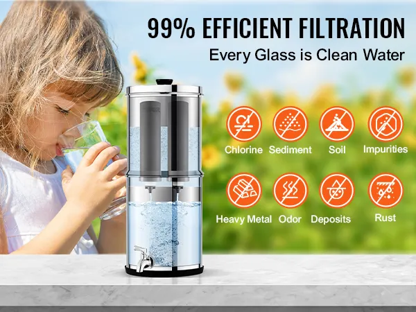 99% effectieve chloorverwijdering: het zwaartekrachtwaterfilter zorgt voor effectieve filtratie met fijne poriën die 99% van het chloor uit water verwijderen. Het verbetert de smaak van water en vermindert zware metalen, sediment, roest, grond en andere verontreinigingen.