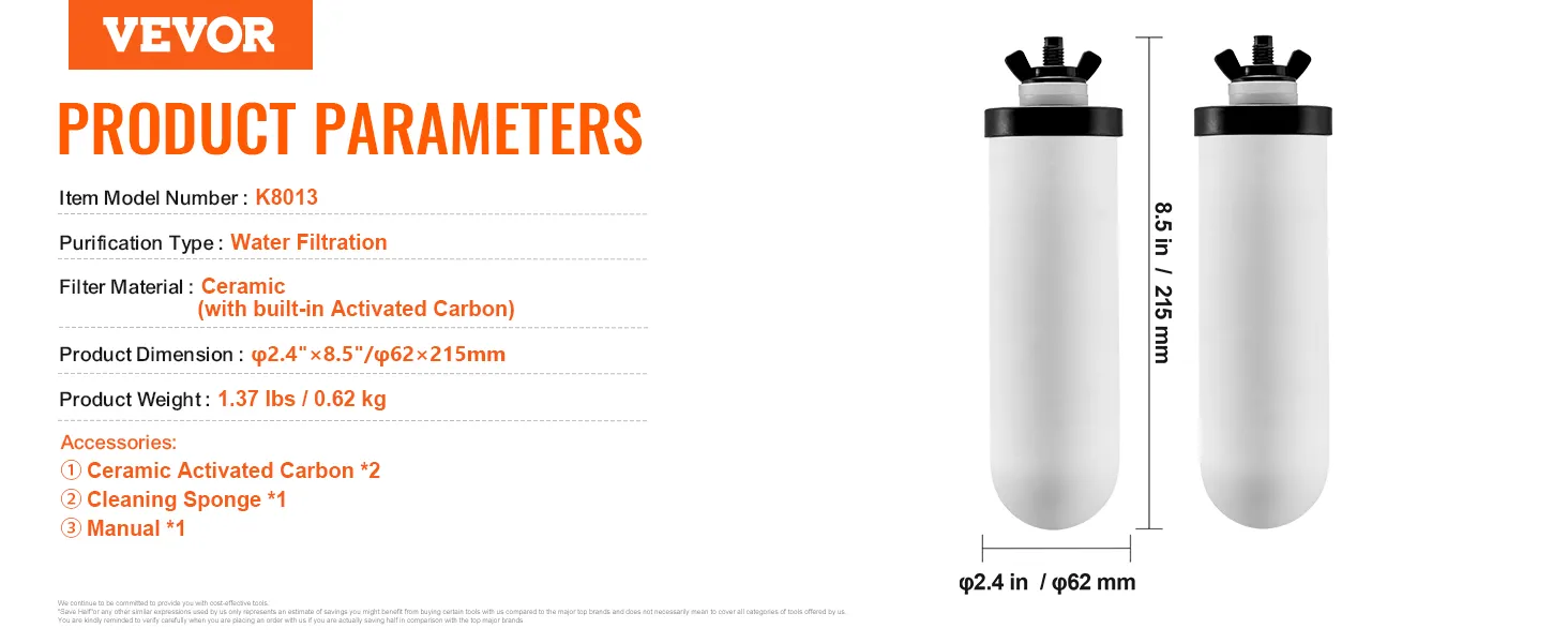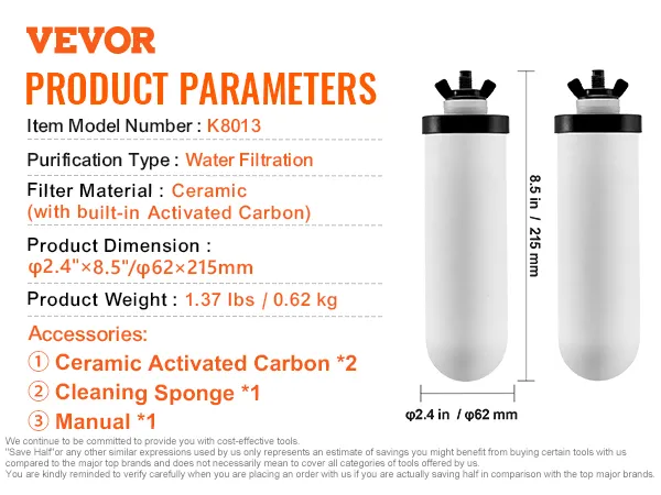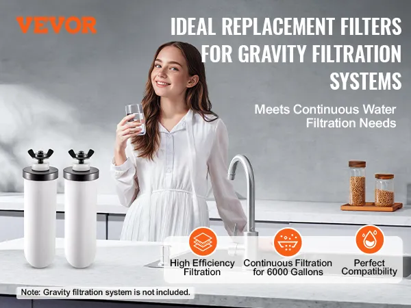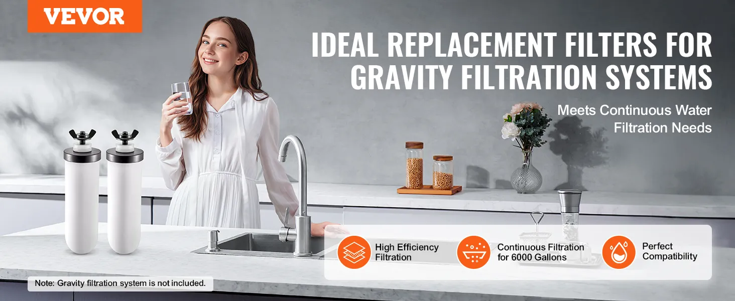Onze vervangingsfilters zijn compatibel met de meeste zwaartekrachtwaterfiltratiesystemen op de markt en voldoen aan uw duurzame drinkwaterbehoeften. Elk paar filters kan continu tot 6.000 liter water zuiveren, waardoor de drinkwaterkosten effectief worden verlaagd.