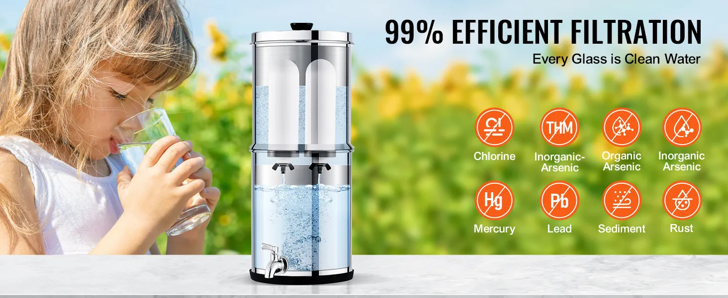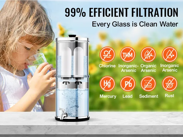 99% effectieve chloorverwijdering: het zwaartekrachtwaterfilter zorgt voor effectieve filtratie met fijne poriën die 99% van het chloor uit water verwijderen. Het verbetert de smaak van water en vermindert zware metalen, sediment, roest, grond en andere verontreinigingen.