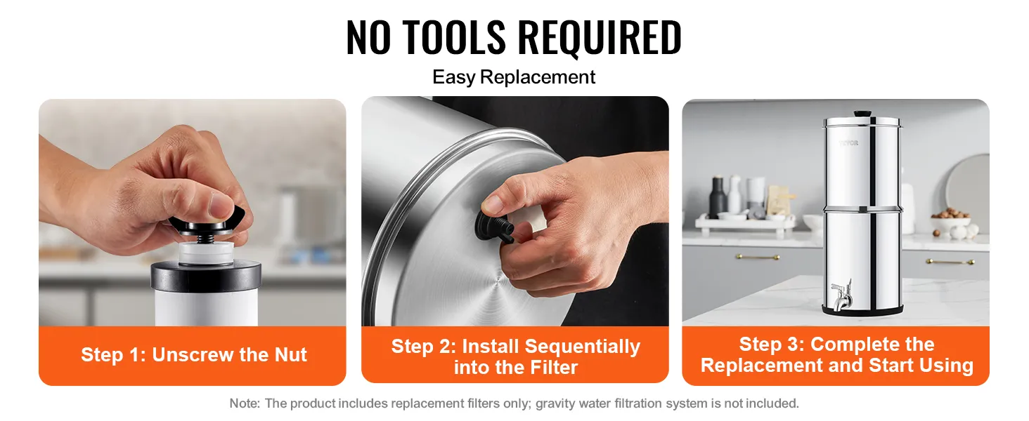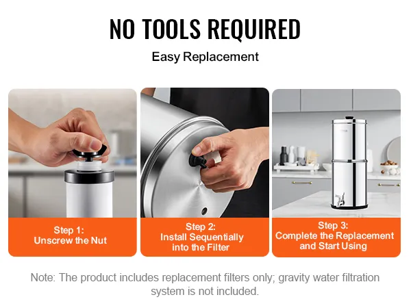 Draai eenvoudigweg de moer los en plaats het filter in het zwaartekrachtwaterfiltersysteem. De nauwsluitende moeren voorkomen lekken en maken het product compatibel met verschillende zwaartekrachtwaterfiltratiesystemen.