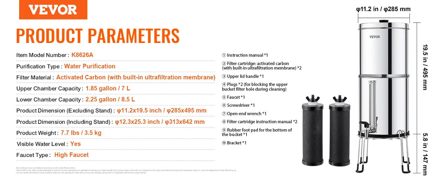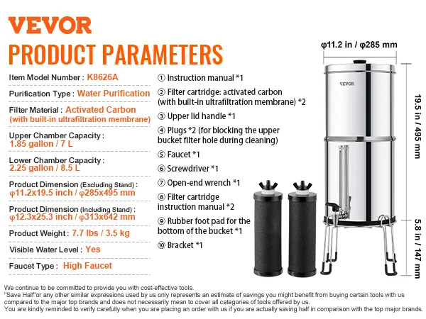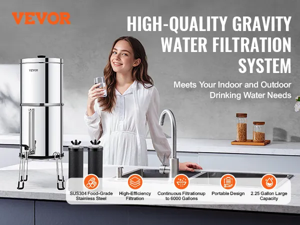 Portable Large Capacity: The 2.25-gallon capacity meets the drinking needs of 1-4 people. The stainless steel countertop water filter uses compact design reduces the volume by half when stored, making it highly portable.