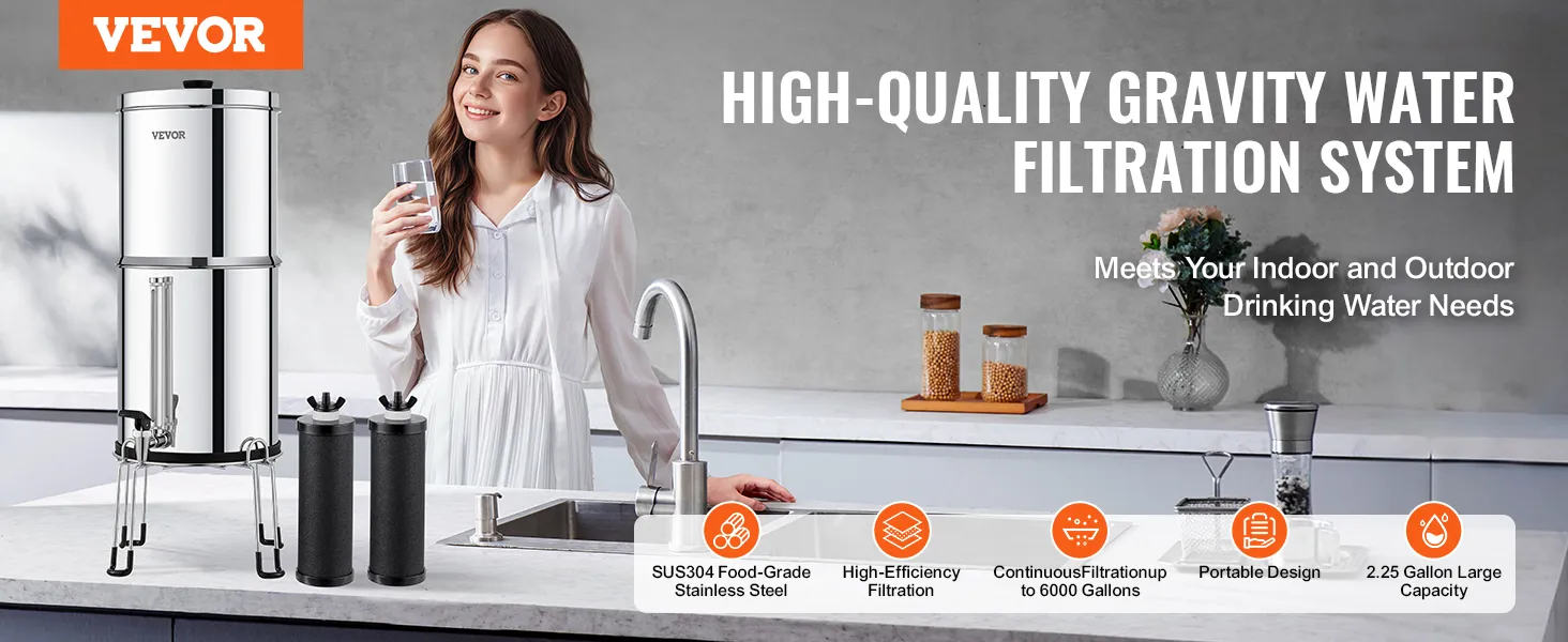 VEVOR Gravity-fed Water Filter System, 2.25G 304 Stainless-Steel Countertop System, Water Filtration System, Reduces Lead and up to 99% of Chlorine, with 2 Carbon Filters, Water Level Spigot, Stand