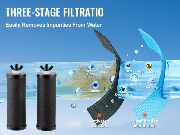 Efficient Filtration: The gravity-fed water filter system use activated carbon + ultrafiltration membrane as the filter medium, removing 99% of chlorine from water and improving its taste. It also reduces heavy metals, sediments, rust, soil, and other impurities, ensuring clean and healthy water.