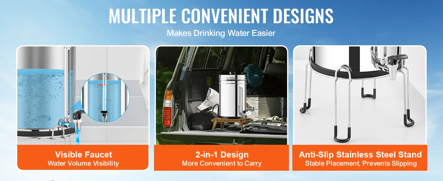 Our stainless-steel countertop system features a visible water faucet, allowing you to check the water level without opening the lid. It is compactly designed, shrinking to half its size for easy storage and portability. It also equipped with a non-slip stand, ensuring stable placement.
