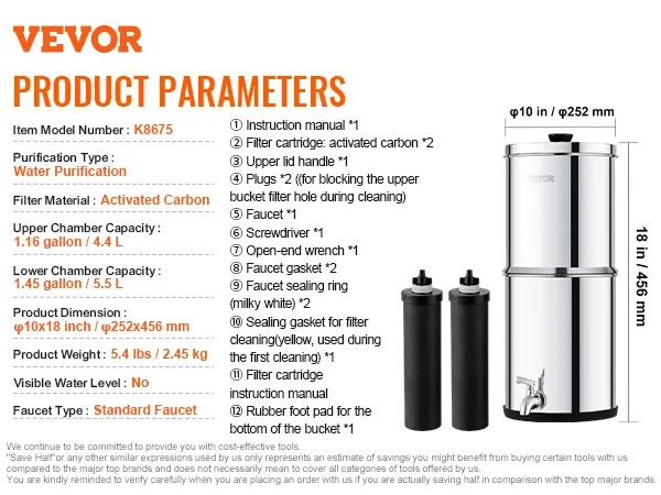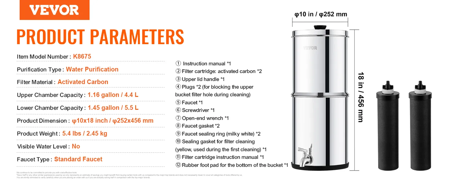 Portable Large Capacity: The 1.45-gallon capacity meets the drinking needs of 1-4 people. The stainless steel countertop water filter uses compact design reduces the volume by half when stored, making it highly portable.
