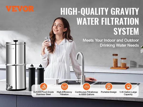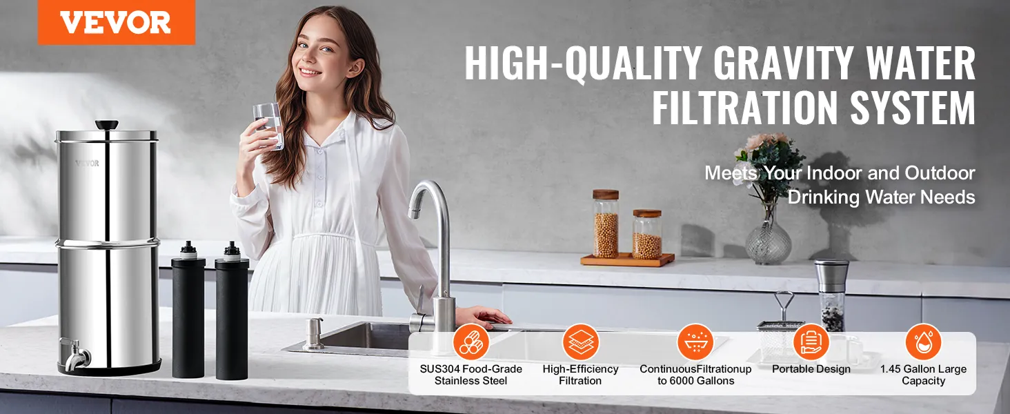 VEVOR Gravity-fed Water Filter System, 1.5G 304 Stainless-Steel Countertop System, Water Filtration System, Reduces Lead and up to 99% of Chlorine, with 2 Carbon Filters & Spigot, for Home Camping RV