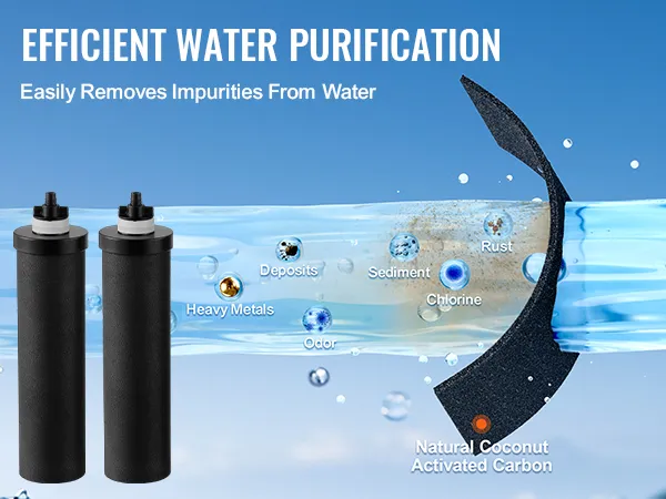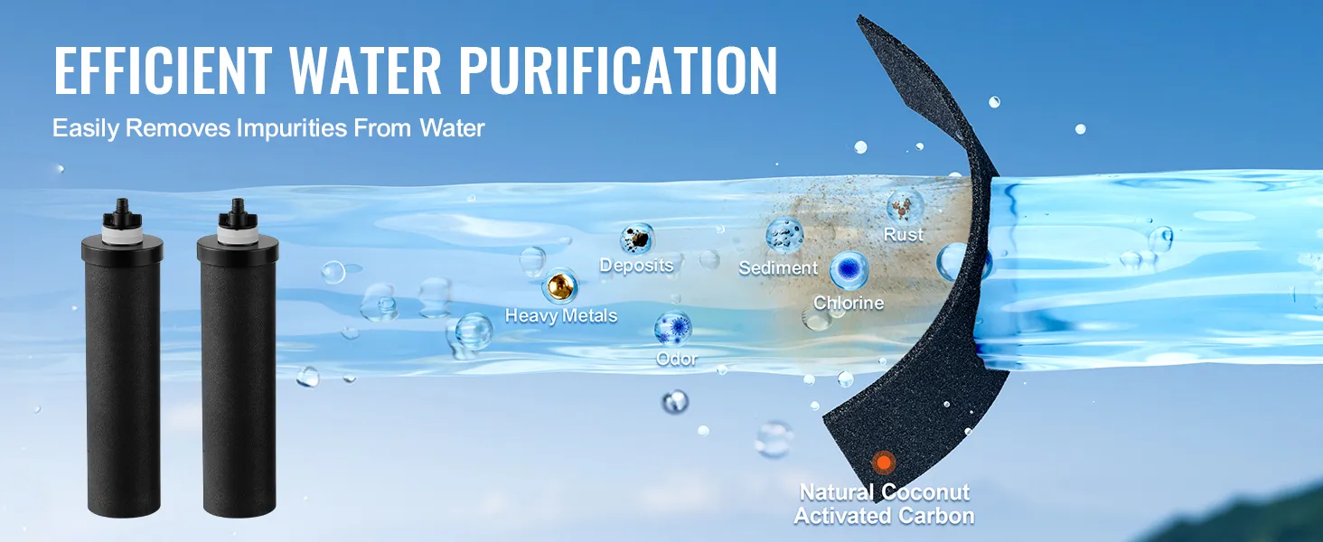 Efficient Filtration: The gravity-fed water filter system uses coconut activated carbon as the filter medium, removing 99% of chlorine from water and improving its taste. It also reduces heavy metals, sediments, rust, soil, and other impurities, ensuring clean and healthy water.