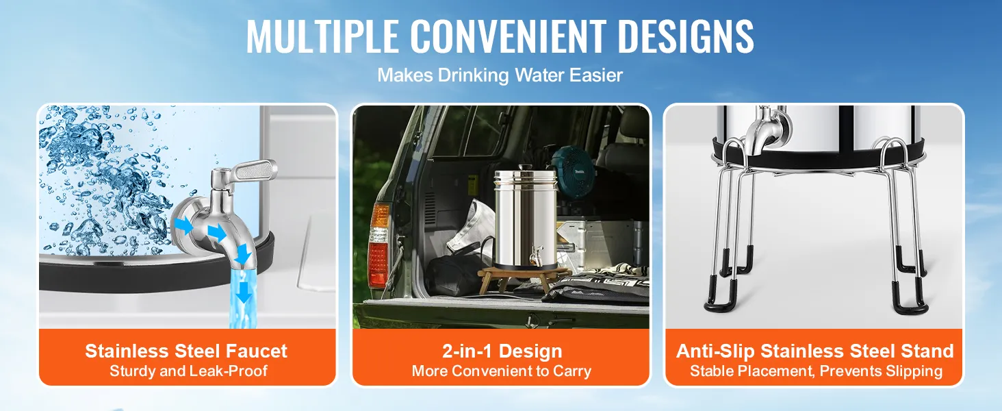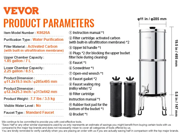 Draagbare grote capaciteit: een capaciteit van 2,25 gallon voldoet aan de drinkwaterbehoeften van 1 tot 4 personen. Het roestvrijstalen tafelwaterfilter met een compact ontwerp halveert het opslagvolume en is daardoor gemakkelijk te transporteren.