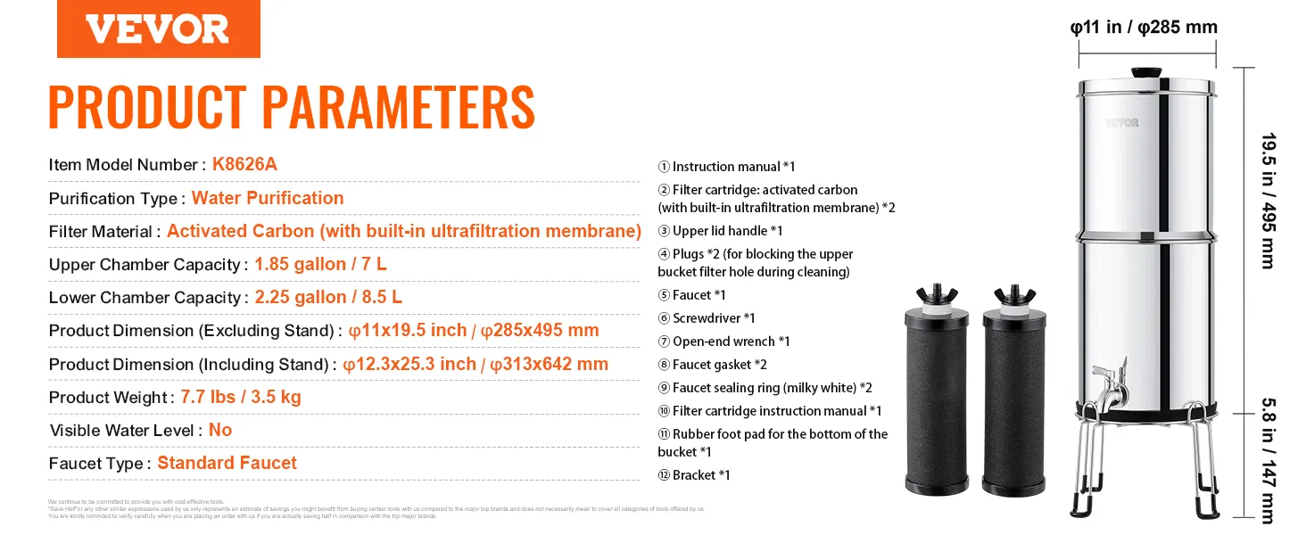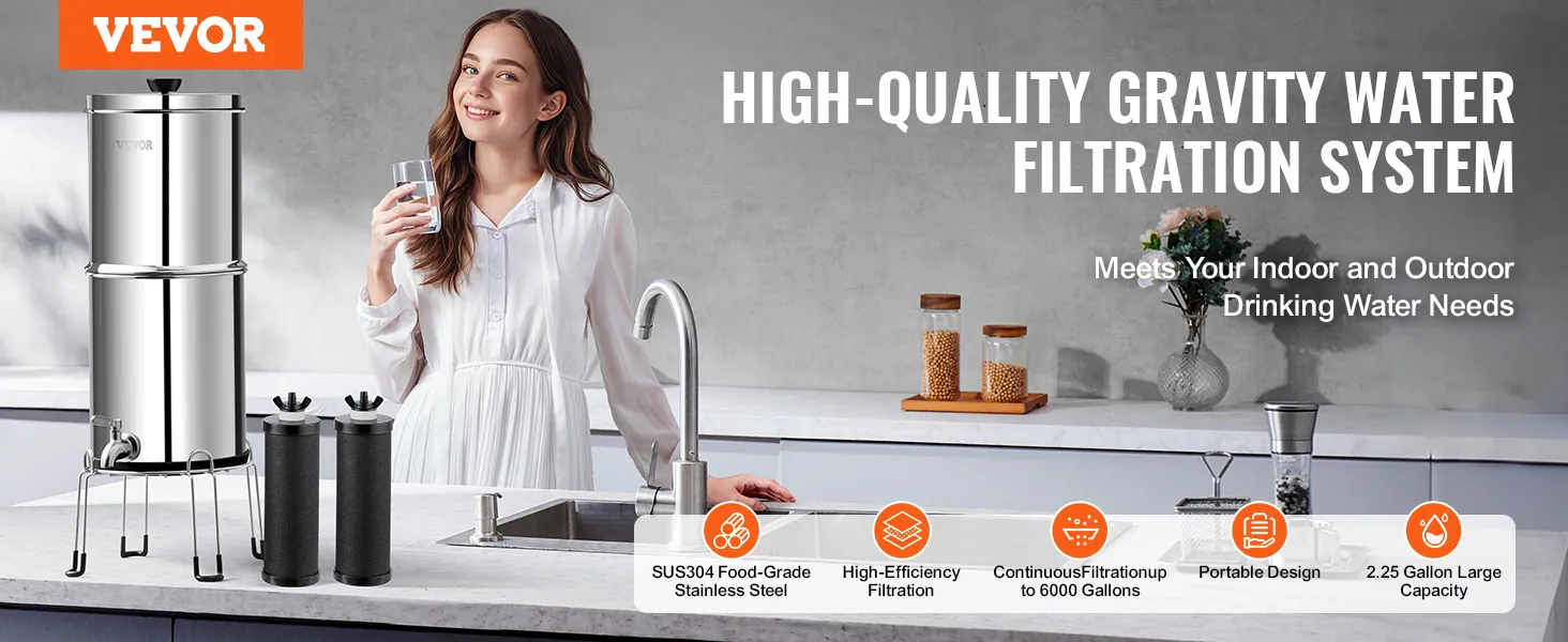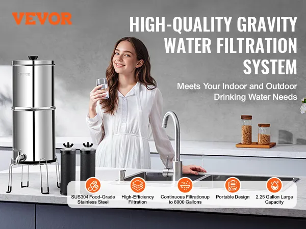 VEVOR Gravity Waterfiltersysteem, 2.25G 304 roestvrij staal aanrechtwaterfiltersysteem, vermindert lood en tot 99% chloor, met 2 koolstoffilters/uitloop/standaard, voor thuis, kamperen, camper