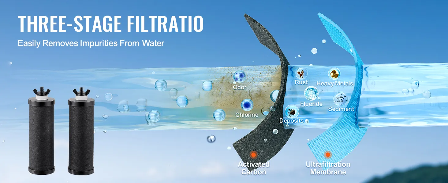 Efficiënte filtratie: het zwaartekrachtwaterfiltersysteem maakt gebruik van actieve kool + ultrafiltratiemembraan als filtermedia, verwijdert 99% chloor uit water en verbetert de smaak. Het vermindert ook zware metalen, sediment, roest, grond en andere verontreinigingen, waardoor schoon en gezond water wordt gegarandeerd.