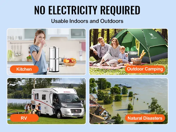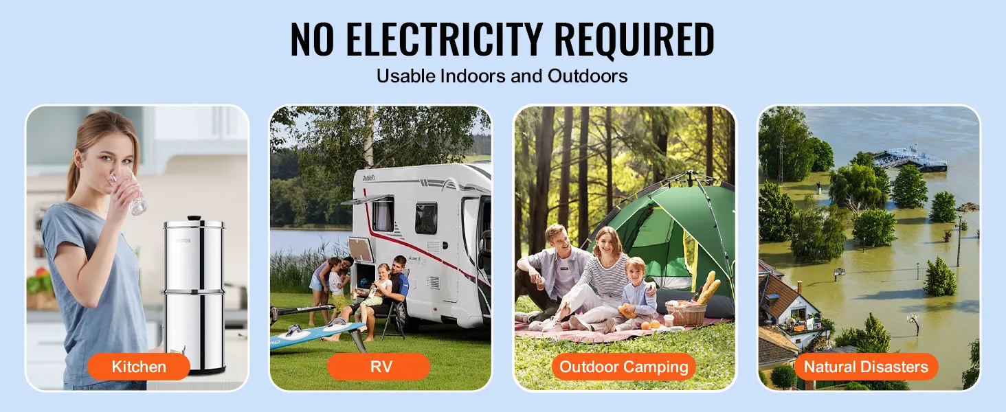 Het is eenvoudig te installeren en vereist geen elektriciteit, gereedschap of loodgieterswerk. Het is geschikt voor diverse omgevingen en zorgt voor schoon, fris drinkwater bij het kamperen, vissen, wandelen, leven zonder elektriciteit en in noodsituaties.