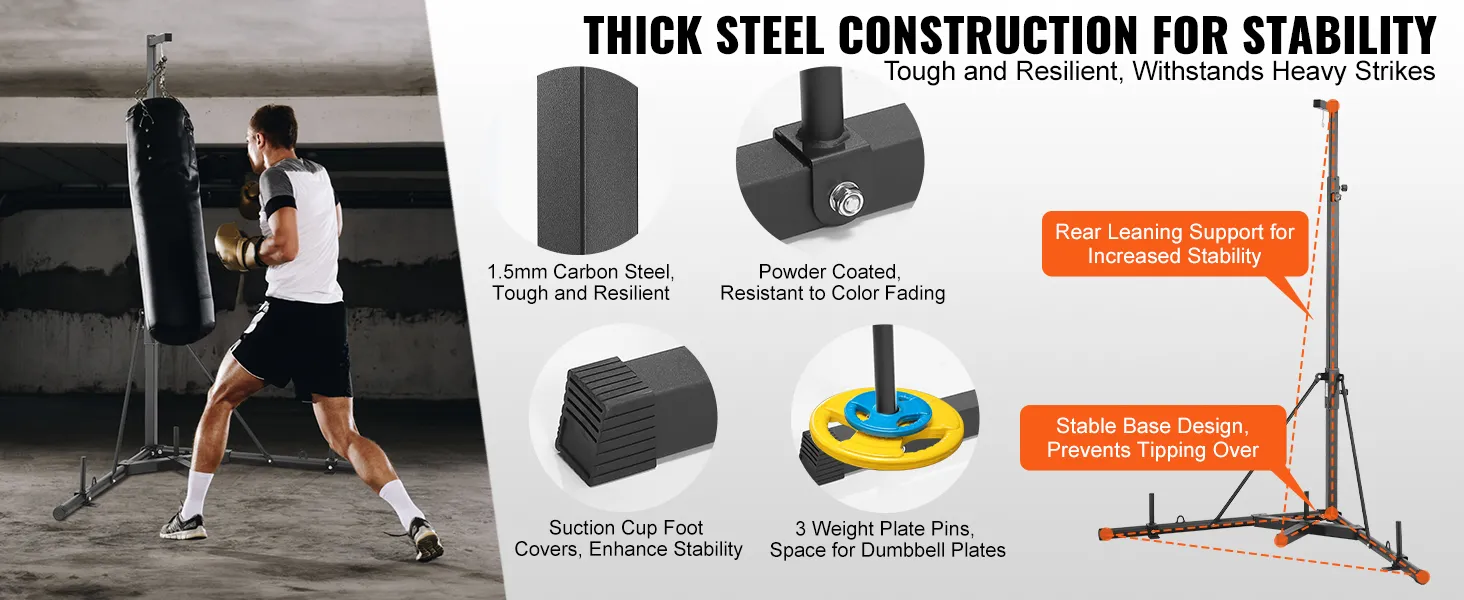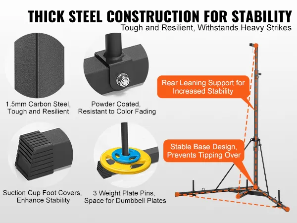 • Stable and Secure: 4 weight plates provide even weight distribution for the boxing equipment. Paired with a stable base and suction cup footings, ensuring the stand remains slip-resistant and steady during use, even in the most intense training sessions, maintaining balance.