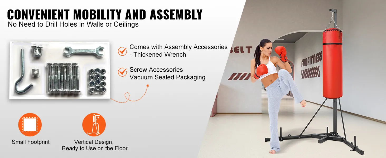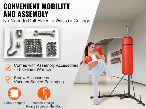 The sandbag rack doesn't require fixing to the floor, just secure the main frame and install the punching bag. With our instructions, the stand can be assembled in minutes. Installation tools are included in the package, and even solo installation by females can be swiftly accomplished.