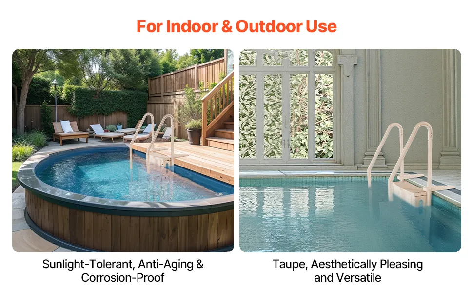 Deze zwembadladder is eenvoudig te installeren, of het nu gaat om binnen- of buitenzwembaden of een waterpark. De taupekleurige afwerking van onze zwembadladder past naadloos bij verschillende interieurstijlen.