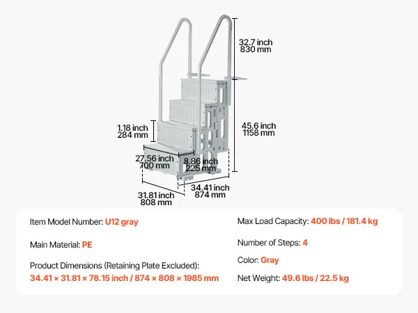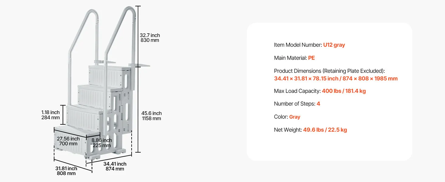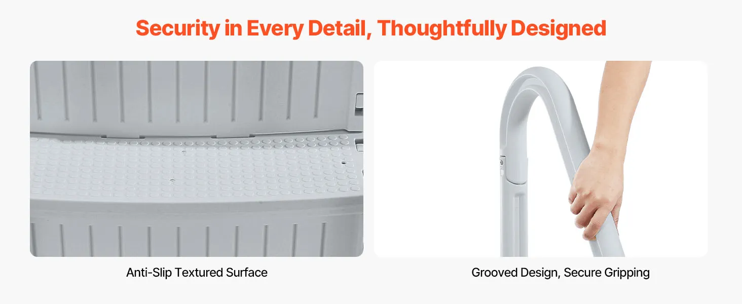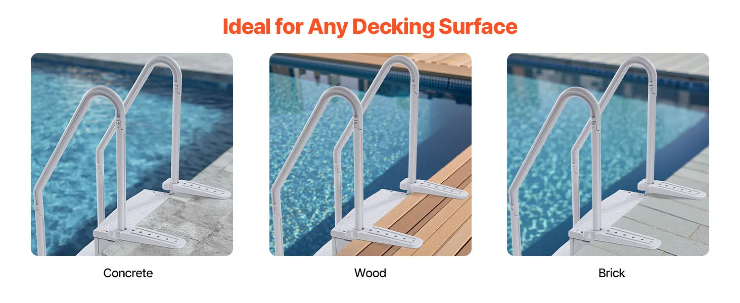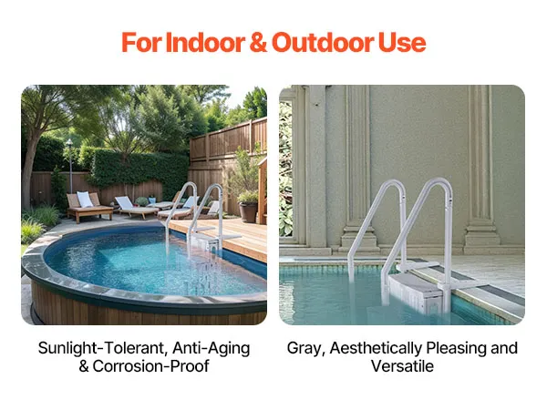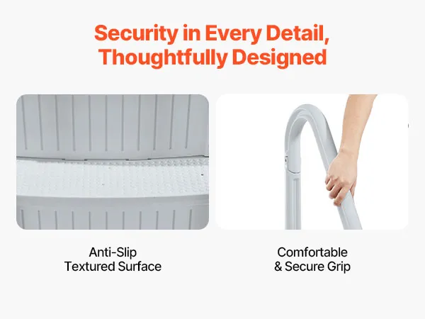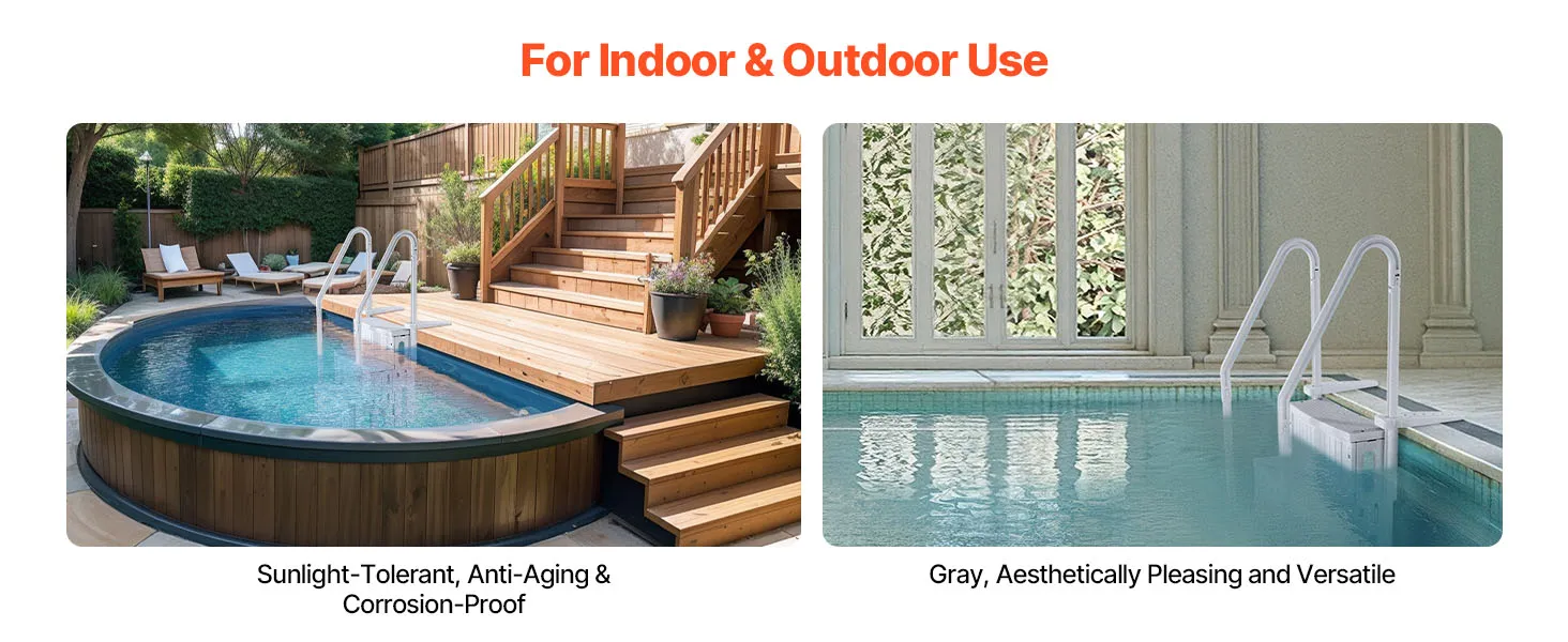 Stevig en duurzaam ontwerp: gemaakt van PE-materiaal, deze zwembadtrap is geschikt voor alle seizoenen en is bestand tegen de harde gevolgen van zonlicht en veroudering buitenshuis. Je kunt erop vertrouwen dat deze ladder ongelukken voorkomt en duurzaam is. De ergonomisch gevormde leuningen met afgeronde randen zorgen voor een comfortabele en veilige grip.