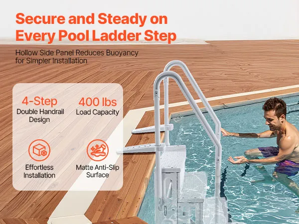 Betrouwbaar draagvermogen van 181,4 kg: Met een draagvermogen tot 181,4 kg is deze zwembadopstap de eerste keuze voor kinderen en volwassenen. De verdikte treeplanken zijn ontworpen met antislip gestructureerde oppervlakken om de veiligheid bij elke stap te garanderen.
