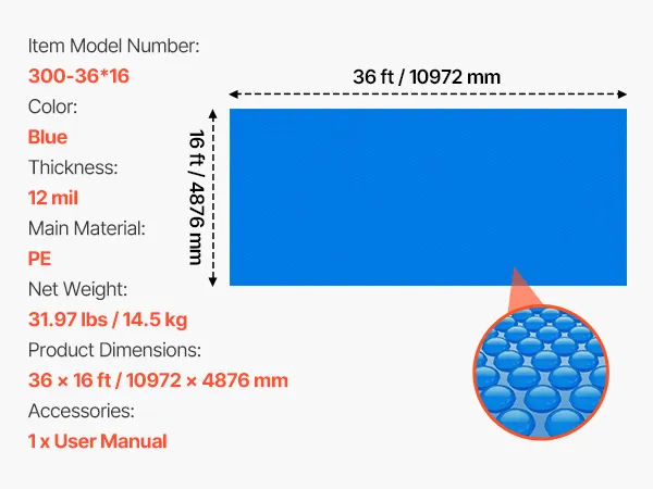 Verleng uw zwemseizoen met onze solar zwembadafdekking van 10972 x 4876 mm. Deze verhoogt de watertemperatuur en houdt de warmte 's nachts vast. Gemaakt van duurzaam 0,3 mm (12 mil) PE-materiaal, vermindert de afdekking de verdamping met 95%, minimaliseert het bijvullen en houdt het uw zwembad schoon.