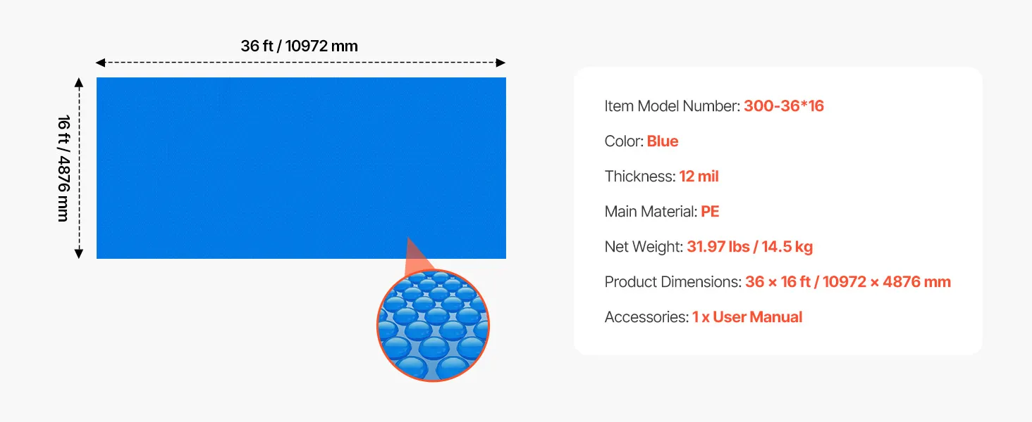 VEVOR Zwembad Solar Cover, 10972x4876 mm, Solar Cover, 0,3 mm Zwembad Solar Deken met Luchtkussen & PE Materiaal, Warmteabsorptie Overdag, Warmteopslag 's Nachts, Solar Covers, Solar Cover, Blauw
