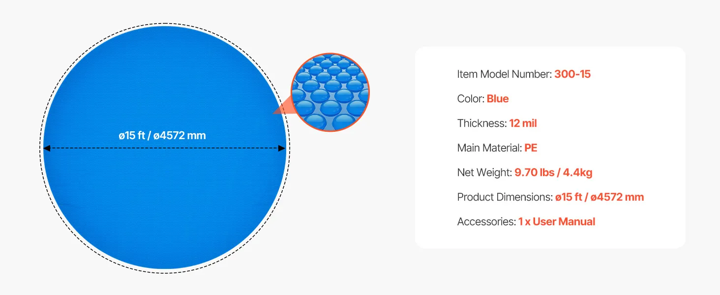Verleng uw zwemseizoen: onze solar afdekking met een diameter van 4572 mm en een dikte van 0,3 mm (12 mil) houdt uw zwembad langer op een comfortabele temperatuur, waardoor u langer van uw zwemseizoen kunt genieten. Nooit meer een koude duik! Eenvoudig te installeren en op maat te snijden voor onregelmatige zwembadvormen.