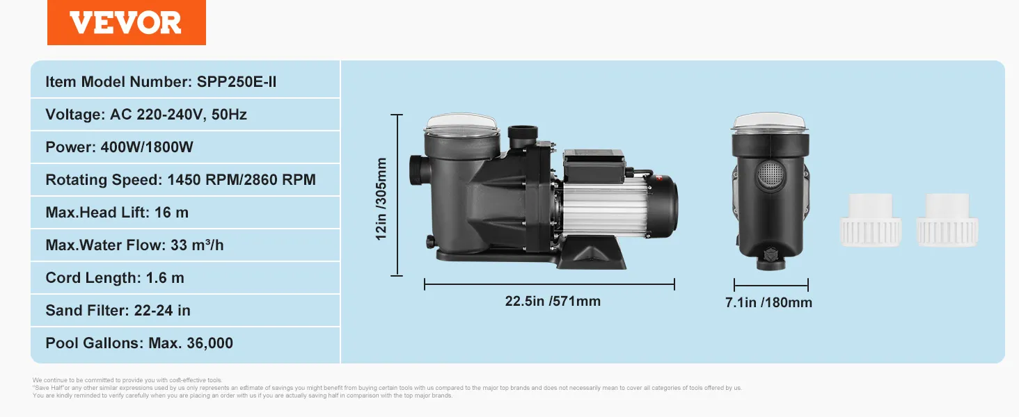 2 PK koperen motoren van topkwaliteit: Spanning: 220V - 240V, 50Hz Een puur koperen motor met een roestvrijstalen motorhuis zorgt niet alleen voor een efficiënte en stabiele werking, maar heeft ook een geïntegreerde thermische beveiliging. Onze zwembadpomp is een perfecte optie voor circulerende waterfiltratie en houdt uw zwembad altijd kristalhelder en hygiënisch. Let op: Netsnoer niet inbegrepen.